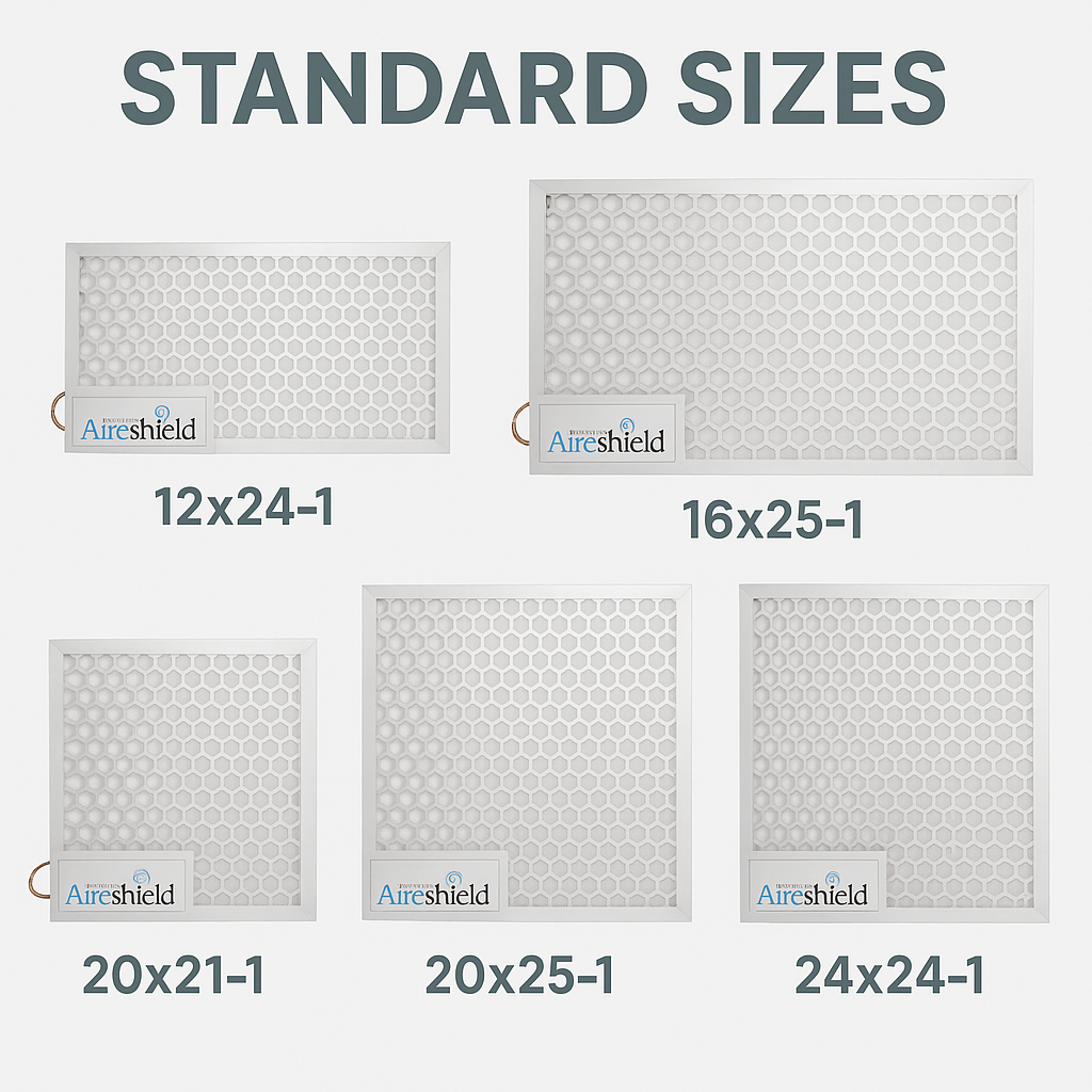 The standard sizes are: 24”x24”x1” (Model AS-2424-1), 25”x20”x1” (Model AS-2025-1), 20”x20”x1” (Model AS-2020-1), 25”x16”x1” (Model AS-1625-1), 24”x12”x1” (Model AS-1224-1).